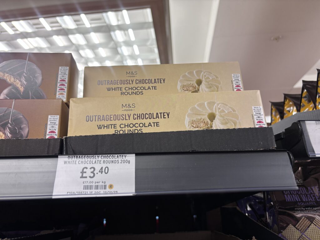 2026年にM&Sを再訪したところ、値段が2.5£から3.4£に値上げしていました。イギリスのインフレ恐るべし。