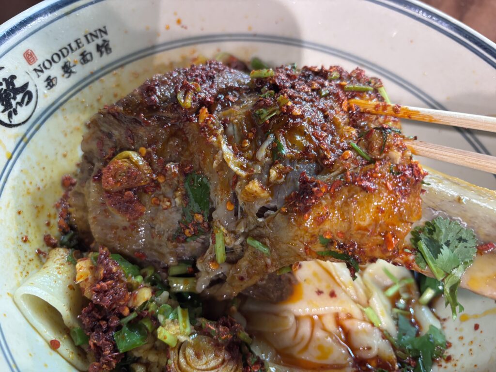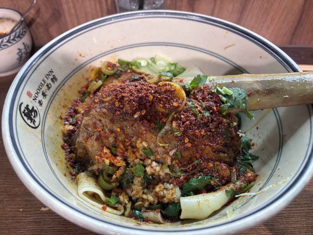2人ともお店の看板料理の刀削麺に骨付き肉が入っているものにしました。注文時に辛いチリを入れていいか?パクチーは食べられるか?と聞いてくれるので、苦手な方はここで調整できると思います。私たちはもちろん全部入り!注文後は結構早めに刀削麺が着丼!お値段は20£ほどでした。