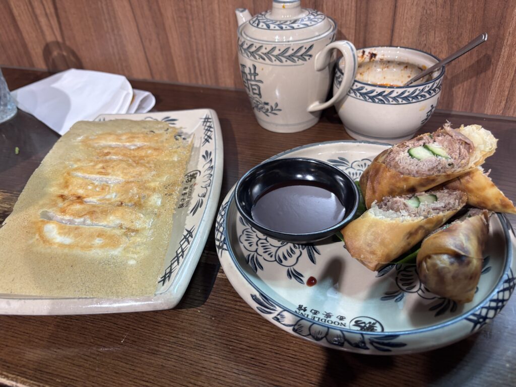 せっかくなので餃子と春巻きも頼んでみました。美味しいのは美味しいですが感動はなかったので、注文はどちらでもいいと思います。あとはお互いアロエジュースを注文しました。