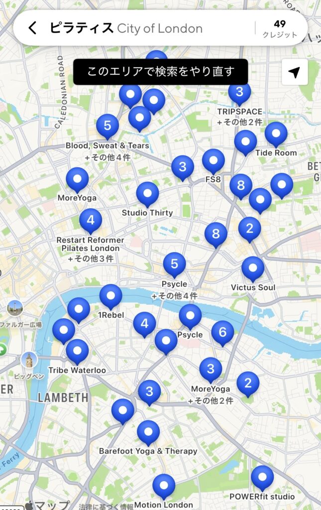 こちらが「ロンドンシティ・ピラティス検索結果」です。驚くほどのジムがありました。またもちろんピラティスだけではなく、ヨガやトレーニング系、プールが使えるジムなども沢山あります。私は1度ホットヨガにも行きました。
