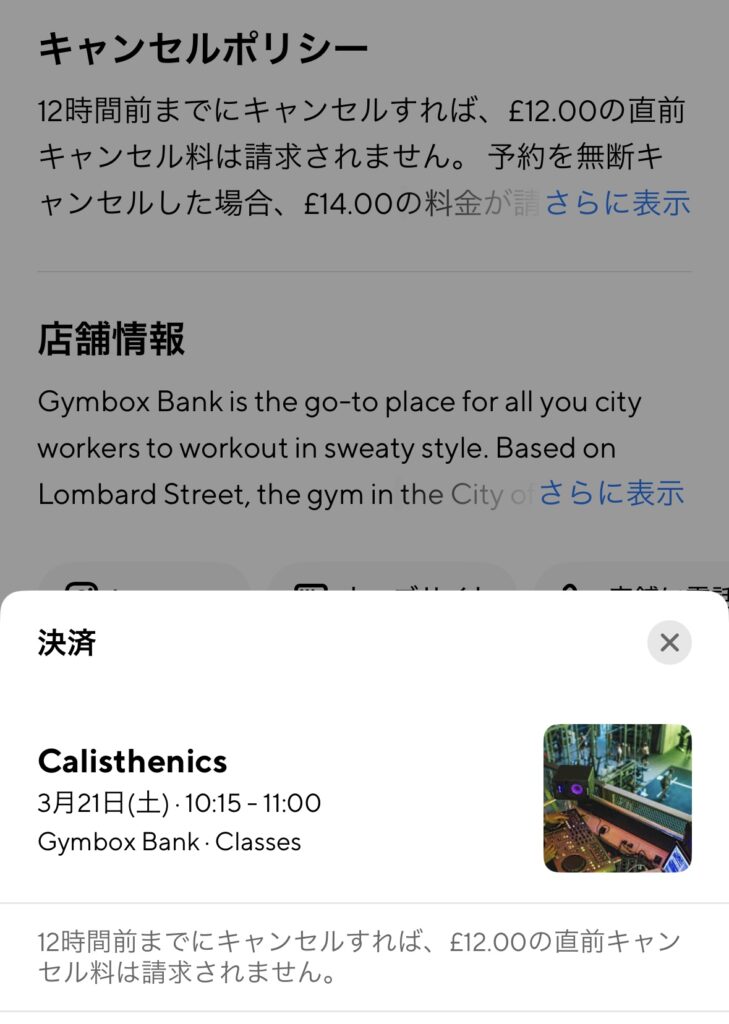 クラスパスは日本にも進出しているので、デバイスの設定を日本語にしていれば、ロンドンのジムの予約でも日本語のまま使用できます。キャンセル料金の注意点など重要な案内も日本語で読めるので、英語に不安があっても安心だと思います◎