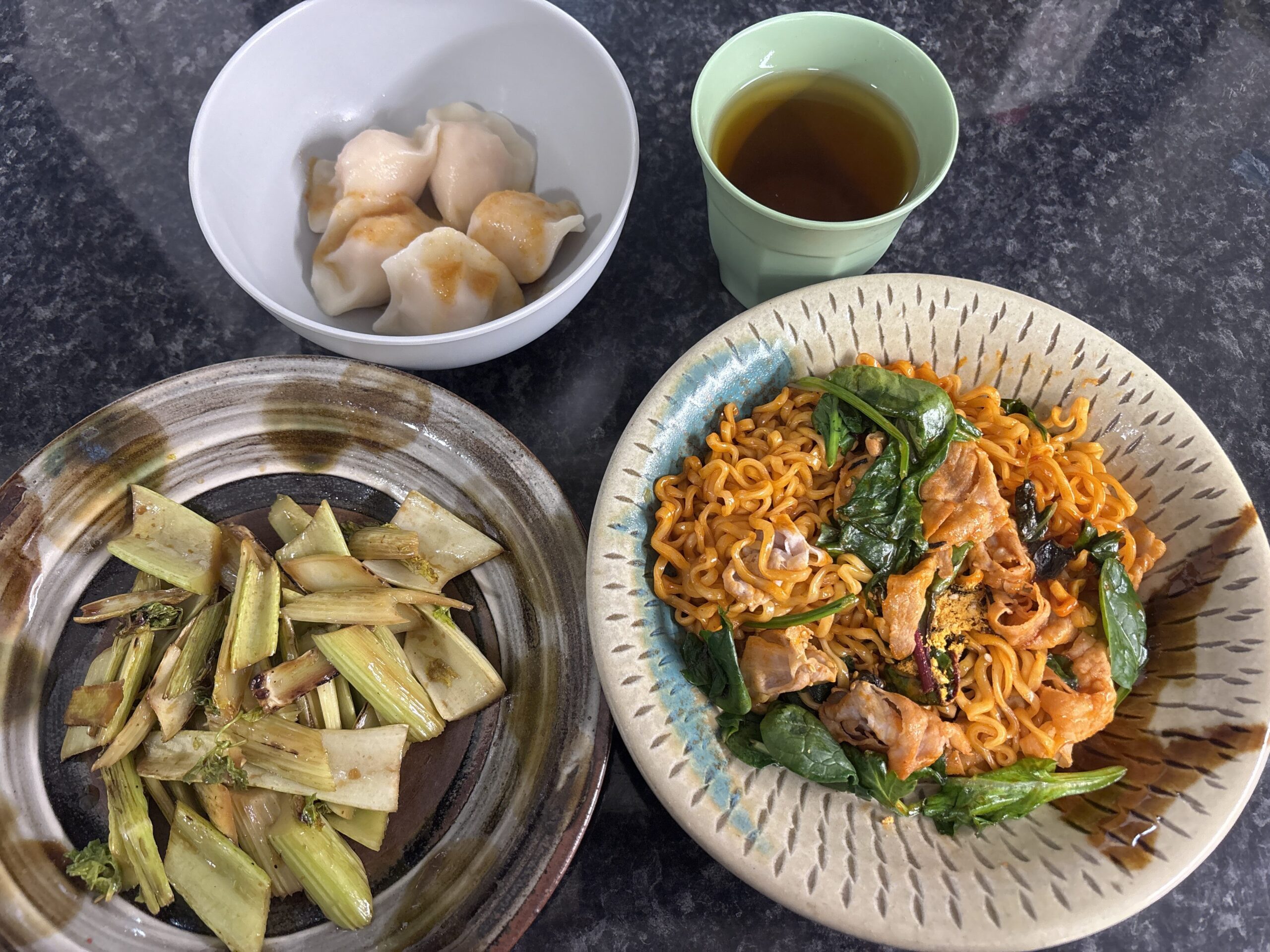 変な組合わせが過ぎますが、カレーとサラダ、エビ餃子。